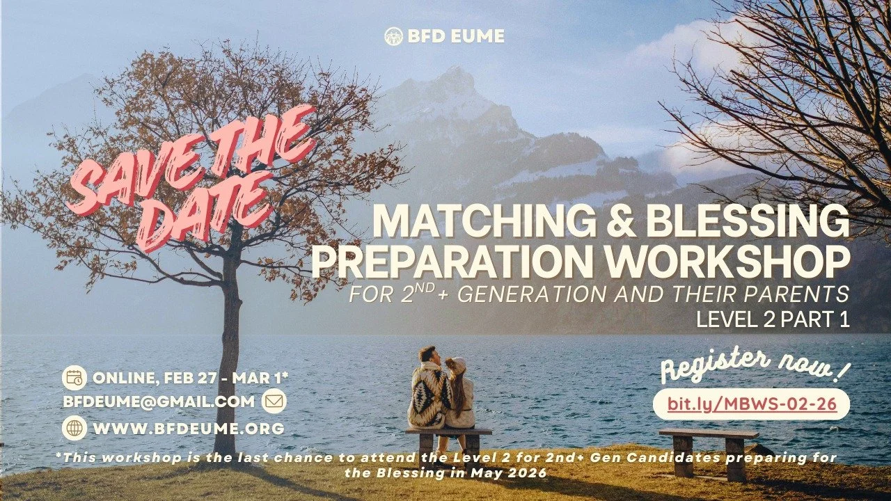 We warmly invite you to the upcoming Level 2 EUME Matching and Blessing Preparation Workshop for 2nd+ Generation and their Parents.